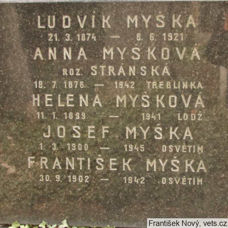 Anna Myšková, 18.7.1876, Praha XII, 9.7.1942 deportována do Terezína, 19.10.1942 do Treblinky