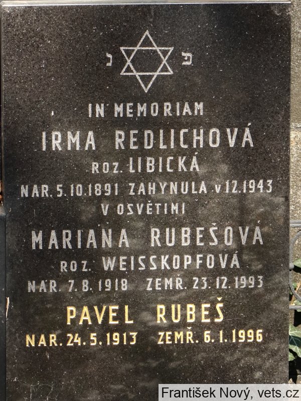 Irma Redlichová, 5.10.1891, Praha XII, 10.12.1941 deportována do Terezína, 18.12.1943 do Osvětimi