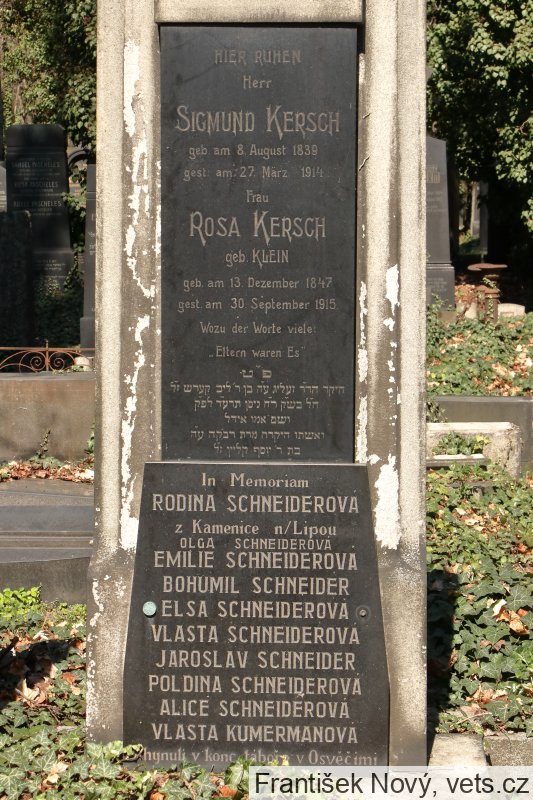 Olga Schneiderová, 11.5.1921, Emilie Schneiderová, 18.6.1888, Bohumil Schneider, 19.1.1891, Eliška Schneiderová, 2.12.1897, Vlasta Schneiderová, 9.19.1922, Jaroslav Schneider, 5.6.1898 a Alice Schneiderová, 29.8.1927, Kamenice nad Lipou, 12.11.1942 deportováni z Tábora do Terezína, 20.1.1943 do Osvětimi