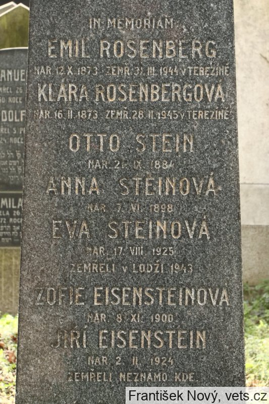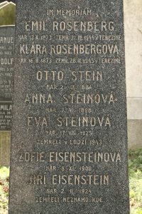 Emil Rosenberg, 12.10.1873 a Klára Rosenbergová, 16.2.1873, Praha X, 20.7.1942 deportována do Terezína, tam Emil zahynul 10.3.1944 a Klára zahynula 5.2.1945 a 9.2.1945 byla zpopelněna