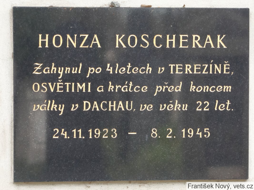 Jan Koscherak, 24.11.1923, Praha V, 4.12.1941 deportován do Terezína, 28.9.1944 do Osvětimi, 10.10.1944 do Dachau, tam zahynul 8.2.1945