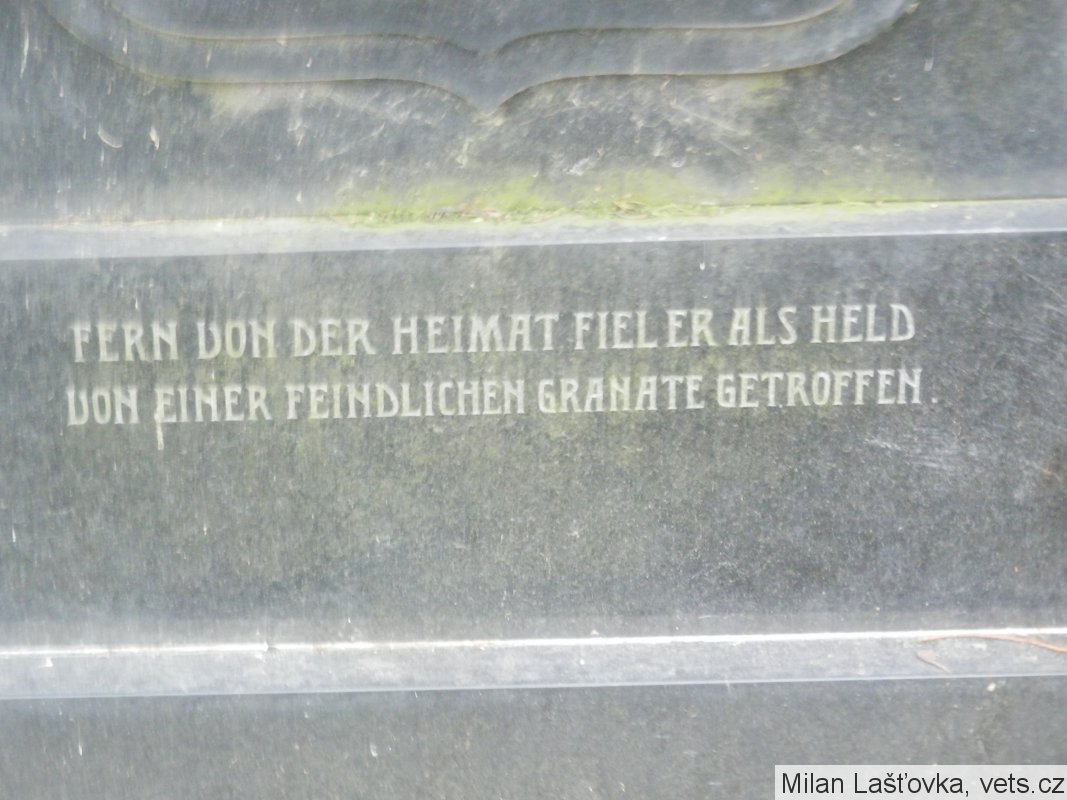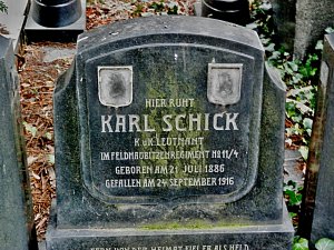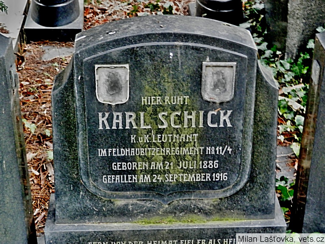Zde odpočívá Karl Schick, C. a K. poručík, z praporu polních houfnic č. 11/4, narozen 1886, padl 24. září 1916. Daleko od vlasti padl jako hrdina, zasažen letícím granátem.