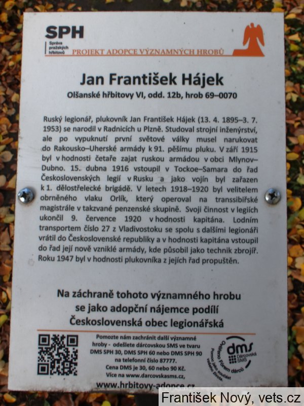 Ruský legionář, plukovník Jan František Hájek (13. 4. 1895 – 3. 7. 1953) se narodil v radnicích u Plzně. Studoval strojní inženýrství, ale po vypuknutí první světové války musel narukovat do Rakousko-Uherské armády k 91. pěšímu pluku. V září 1915 byl v hodnosti četaře zajat ruskou armádou v obci Mlynov-Dubno. 15. února 1916 vstoupil v Trockoe-Samara do řad Československých legií v Rusku a jako vojín byl zařazen k 1. dělostřelecké brigádě. V letech 1918 – 1920 byl velitelem obrněného vlaku Orlík, která operoval na transsibiřské magistrále v takzvané penzenské skupině. Svoji činnost v legiích ukončil 9. července 1920 v hodnosti kapitána. Lodním transportem číslo 27 z Vladivostoku se spolu s dalšími legionáři vrátil do Československé republiky a v hodnosti kapitána vstoupil do řad její nově vzniklé armády, kde působil jako technik zbrojíř. Roku 1947 byl v hodnosti plukovníka z jejích řad propuštěn.