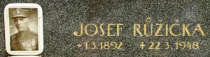 Josef Růžička, klempíř, vojín zákopnického praporu 8, zajat 14.2.1915 v Karpatech, 6.8.1916 zařazen v hodnosti vojína do 2. střeleckého pluku čs. legií v Rusku, demobilizován 14.6.1920 v hodnosti šikovatele