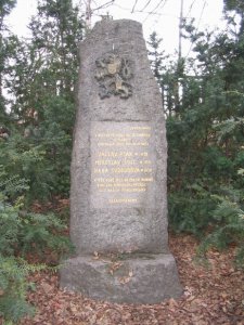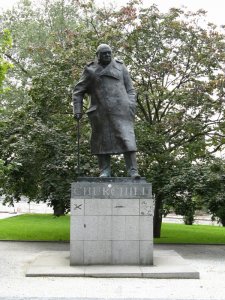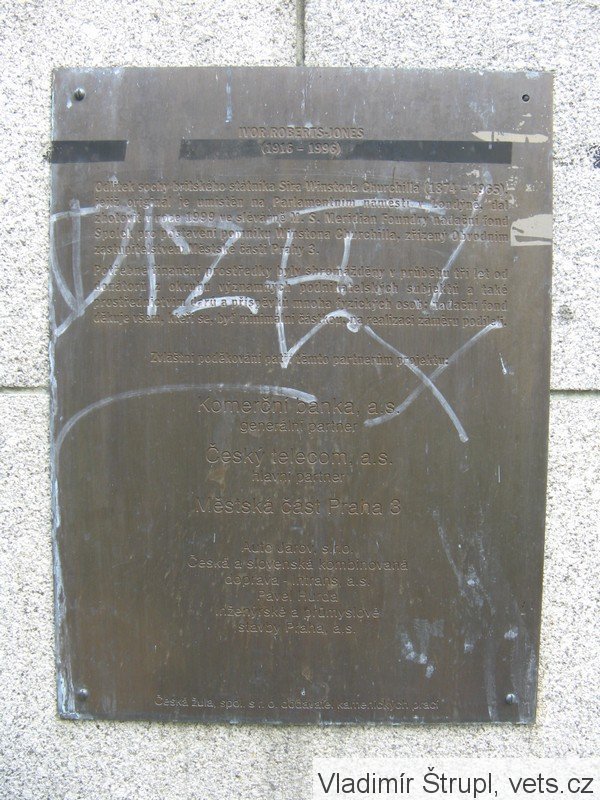ODLITEK SOCHY BRITSKÉHO STÁTNÍKA SIRA WINSTONA CHURCHILLA (1874-1965), JEJÍŽ ORIGINÁL JE UMÍSTĚN NA PARLAMENTNÍM NÁMĚSTÍ V LONDÝNĚ, DAL ZHOTOVIT V ROCE 1999 VE SLÉVÁRNÁCH M. S. MERIDIAN FOUNDRY NADAČNÍ FOND SPOLEK PRO POSTAVENÍ POMNÍKU WINSTONA CHURCHILLA, ZŘÍZENÝ OBVODNÍM ZASTUPITELSTVEM MĚSTSKÉ ČÁSTI PRAHY 3.