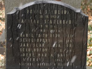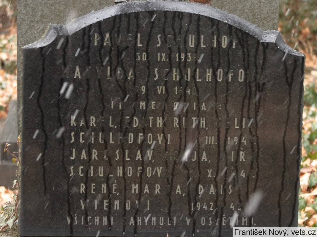 Karel Schulhof, 5.12.1895, Edita Schulhofová, 18.10.1902, Ruth Schulhofová, 13.6.1928 a Felix Schulhof, 7.8.1929, Praha I, 6.3.1943 deportováni do Terezína, 6.9.1943 do Osvětimi