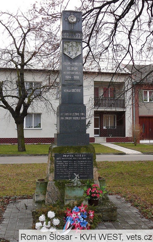Památník byl původně věnován padlým v 1. světové válce. Po 2. světové válce byl doplněn o pamětní desku se jmény obětí nacistické persekuce. V průběhu bojů o obec nedošlo ke ztrátám na životech místních občanů s výjimkou děvečky z čísla 32, pocházející z Hodonína, která byla těžce zraněna střepinou a svému zranění později v nemocnici podlehla.