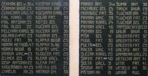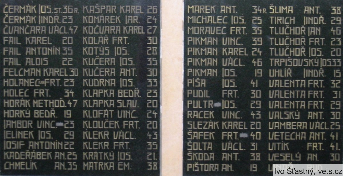MAREK ANT. 24, MICHALEC JOS., MORAVEC FRT. 35, PIKMAN VINC. 39, PIKMAN KAREL 24, PIKMAN VÁCL. 46, PIKMAN JOS. 19, PÍŠA JOS. 41, PUDIL FRT. 30, PULTR JOS. 29, RACEK VINC. 43, SLEZÁK KAREL 20, ŠAFEK FRT. 40, ŠOLTA VÁCL. 31, ŠKODA ANT. 38, PIŠTORA ANT. 19, ŠLIMA ANT. 38, TIRICH JINDŘ. 29, TLUČHOŘ JAN 46, TLUČHOŘ FRT. 23, TLUČHOŘ JOS. 20, TRPIŠOVSKÝ JOS. 33, UHLÍŘ JINDŘ. 15, VALENTA FRT. 32, VALENTA FRT. 31, VALENTA FRT. 29, VALSKÝ ANT. 30, VAMBERA VÁCL. 25, VETECHA ANT. 41, VITÍK FRT. 41, VESELÝ AN. 30, VINAŘ RUD.