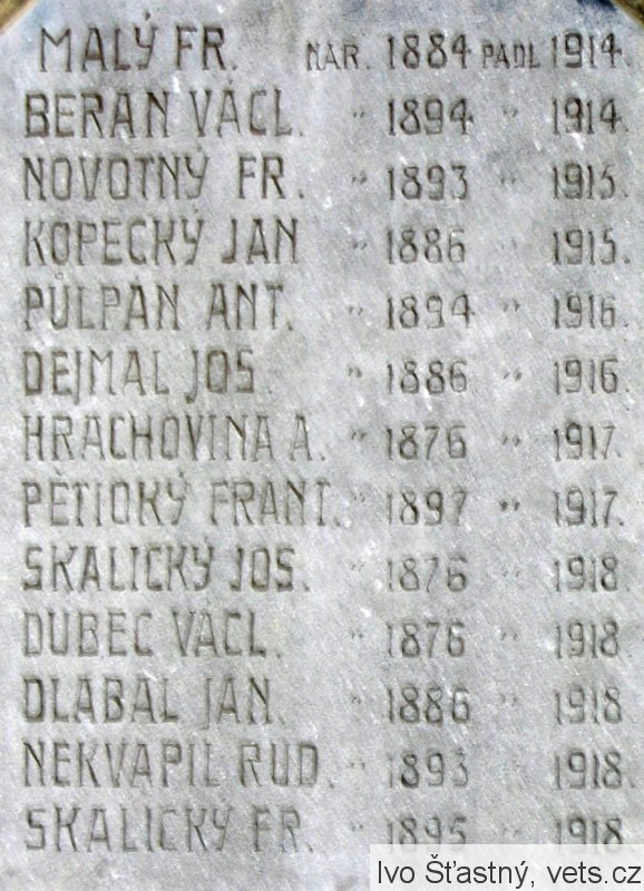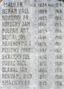 MALÝ FR. NAR. 1884 PADL 1914, BERAN VÁCL. 1894-1914, NOVOTNÝ FR. 1893-1915, KOPECKÝ JAN 1886-1915, PŮLPÁN ANT. 1894-1916, DEJMAL JOS. 1886-1916, HRACHOVINA A. 1876-1917, PĚTIOKÝ FRANT. 1897-1917, SKALICKÝ JOS. 1876-1918, DUBEC VÁCL. 1876-1918, DLABAL JAN 1886-1918, NEKVAPIL RUD. 1893-1918, SKALICKÝ FR. 1895-1918