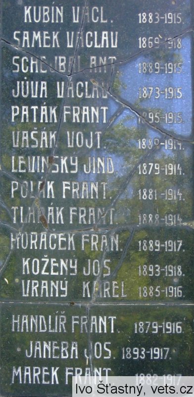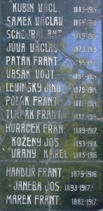 KUBÍN VÁCL. 1883-1915, SAMEK VÁCLAV 1869-1918, SCHEJBAL ANT. 1889-1915, JŮVA VÁCLAV 1873-1915, PATÁK FRANT. 1895-1915, VAŠÁK VOJT. 1889-1914, LEVINSKÝ JIND. 1879-1914, POLÁK FRANT. 1881-1914, TLAPÁK FRANT. 1888-1914, HORÁČEK FRAN. 1889-1917, KOŽENÝ JOS. 1893-1918, VRANÝ KAREL 1885-1916, HANDLÍŘ FRANT. 1879-1916, JANEBA JOS. 1893-1917, MAREK FRANT. 1882-1917