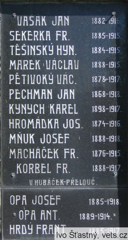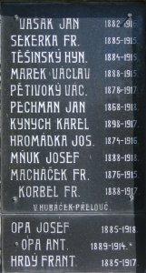 VAŠÁK JAN 1882-1916, SEKERKA FR. 1885-1915, TĚŠINSKÝ HYN. 1884-1915, MAREK VÁCLAV 1888-1915, PĚTIVOKÝ VÁC. 1878-1917, PECHMAN JAN 1868-1918, KYNYCH KAREL 1898-1917, HROMÁDKA JOS. 1874-1916, MŇUK JOSEF 1888-1918, MACHÁČEK FR. 1876-1915, KORBEL FR. 1888-1917, OPA JOSEF 1885-1918, OPA ANT. 1889-1914, HRDÝ FRANT. 1885-1917