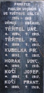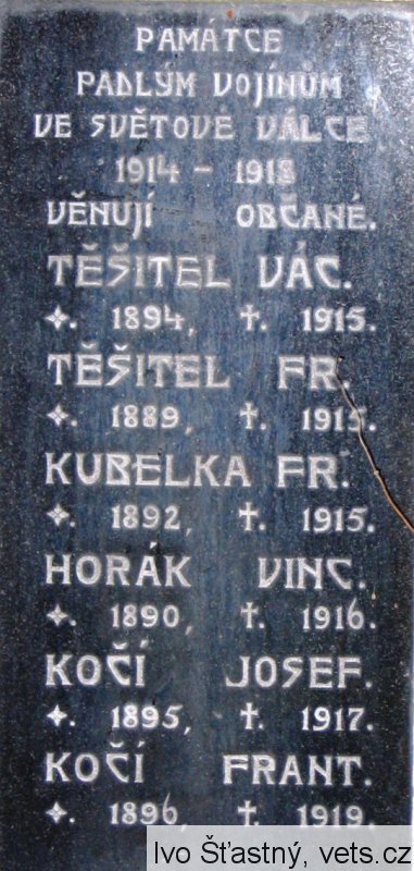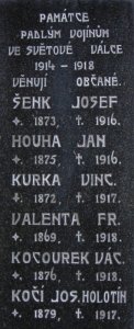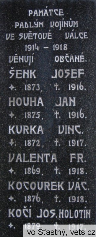 TĚŠITEL VÁC. *1894 +1915, TĚŠITEL FR. *1889 +1915, KUBELKA FR. *1892 +1915, HORÁK VINC. *1890 +1916, KOČÍ JOSEF *1895 +1917, KOČÍ FRANT. *1896 +1919, ŠENK JOSEF *1873 +1916, HOUHA JAN *1875 +1916, KURKA VINC. *1872 +1917, VALENTA FR. *1869 +1918, KOCOUREK VÁC. *1876 +1918, KOČÍ JOS. HOLOTÍN *1879 +1917