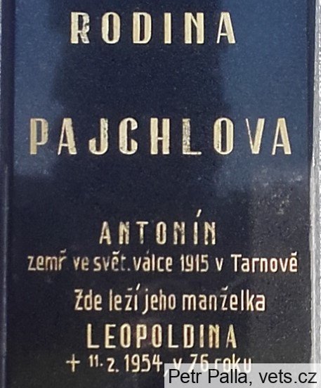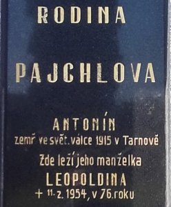 Pajchl Antonín (v seznamu ztrát psán jako Peichel): *1877. Inft., k. k. LIR. Nr. 13, 13. Komp. +10.5.1915 Deutschordens Verwundetenspital Nr. 4, Tarnòw. Střelná rána plic, otrava krve. Pohřben na vojenském hřbitově Tarnòw.