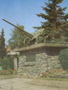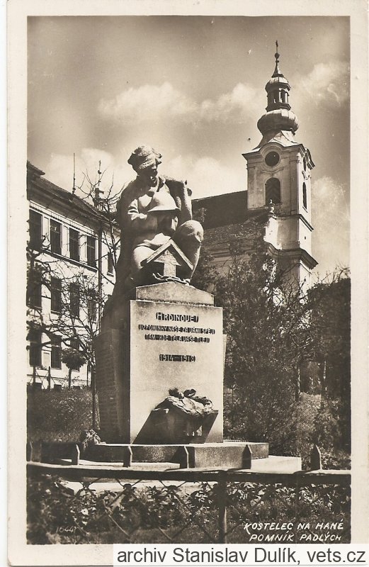 Původně pomník s tankem a deskou s nápisem RUDÉ ARMÁDĚ. Ta byla odstraněna, spolu s protitankovým kanonem z pomníku, po sametové revoluci. Fotografie původního vzhledu pomníku je z knihy Prostějovsko ve fotografiích 1985, autor fotografie Jan Pospíšil.