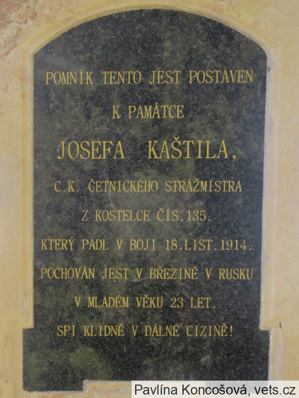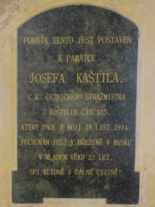 Kaštil Josef: *1892 Kostelec. Vizewachtmeister beim k. k. Landesgendarmeriekommando Nr. 4. Po vypuknutí války u polního četnictva, služba jako Zugskommandant beim k. k. Landwehrinfanterieregiment Nr. 34. Padl v bitvě u Rzeplinu, Ruské Polsko, 19.11.1914.