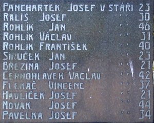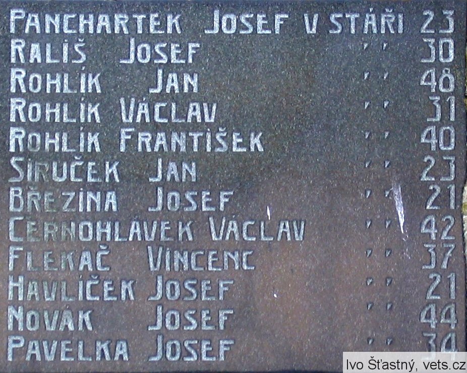 PANCHARTEK JOSEF V STÁŘÍ 23, RALIŠ JOSEF V STÁŘÍ 30, ROHLÍK JAN V STÁŘÍ 48, ROHLÍK VÁCLAV V STÁŘÍ 31, ROHLÍK FRANTIŠEK V STÁŘÍ 40, SIRUČEK JAN V STÁŘÍ 23, BŘEZINA JOSEF V STÁŘÍ 21, ČERNOHLÁVEK VÁCLAV V STÁŘÍ 42, FLEKAČ VINCENC V STÁŘÍ 37, HAVLÍČEK JOSEF V STÁŘÍ 21, NOVÁK JOSEF V STÁŘÍ 44, PAVELKA JOSEF V STÁŘÍ 34.
