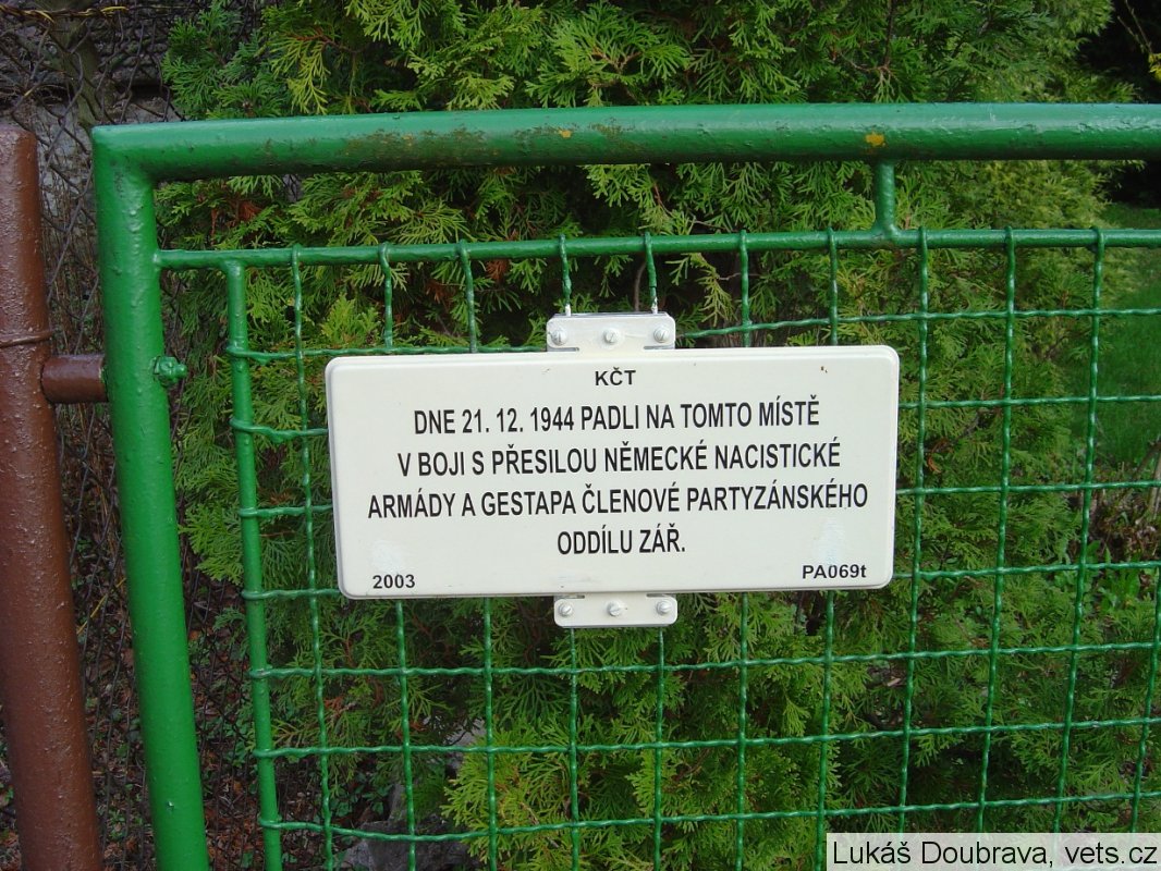 Poslední jméno je na desce uvedeno nesprávně, samopalník Ostašov se jmenoval Oleg. Partyzánský oddíl Záře se zúčastnil SNP a po jeho pádu se v listopadu 1944 přesunul do PČaM. Oblastí jeho zpravodajského a diversního působení bylo Žďársko a částečně v Železných horách a na Tišnovsku. Údajně zničil 18 vlaků, 22 lokomotiv, 120 vagónů a 27 plošinových vagónů s technikou, 6 mostů, 3 vedení vysokého napětí, 4 lihovary a pobil na 1000 nepřátelských vojáků. Zde, v Krasnicích, zničená a dnes oslavená diversní skupina byla vyslána velitelem oddílu P. V. Fjodorovem - Faustovem ke zničení železniční trati Kolín - Pardubice. (zdroj databáze CEVH MO ČR)