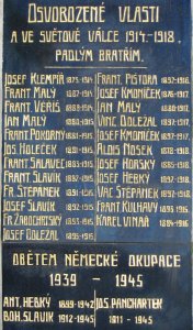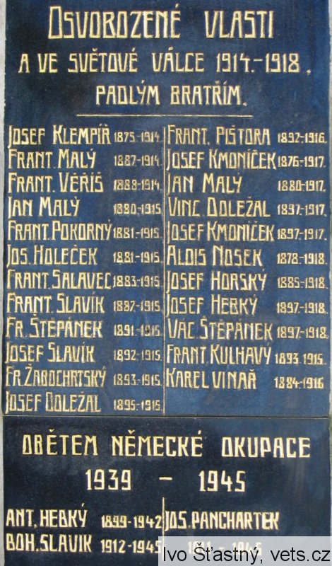 JOSEF KLEMPÍŘ 1875 – 1914, FRANT. MALÝ 1887 – 1914, FRANT. VĚŘÍŠ 1888 – 1914, JAN MALÝ 1880 – 1915, FRANT. POKORNÝ 1881 – 1915, JOS. HOLEČEK 1881 – 1915, FRANT. SALAVEC 1883 – 1915, FRANT. SLAVÍK 1887 - 1915, FR. ŠTĚPÁNEK 1891 – 1915, JOSEF SLAVÍK 1892 – 1915, FR. ŽABOCHRTSKÝ 1893 – 1915, JOSEF DOLEŽAL 1895 – 1915, FRANT. PIŠTORA 1892 – 1916, JOSEF KMONÍČEK 1876 – 1917, JAN MALÝ 1880 - 1917, VINC. DOLEŽAL 1897 – 1917, JOSEF KMONÍČEK 1897 – 1917, ALOIS NOSEK 1878 – 1918, JOSEF HORSKÝ 1885 – 1918, JOSEF HEBKÝ 1897 – 1918, VÁC. ŠTĚPÁNEK 1897 – 1918, FRANT. KULHAVÝ 1893 – 1915, KAREL VINAŘ 1884 – 1916