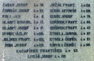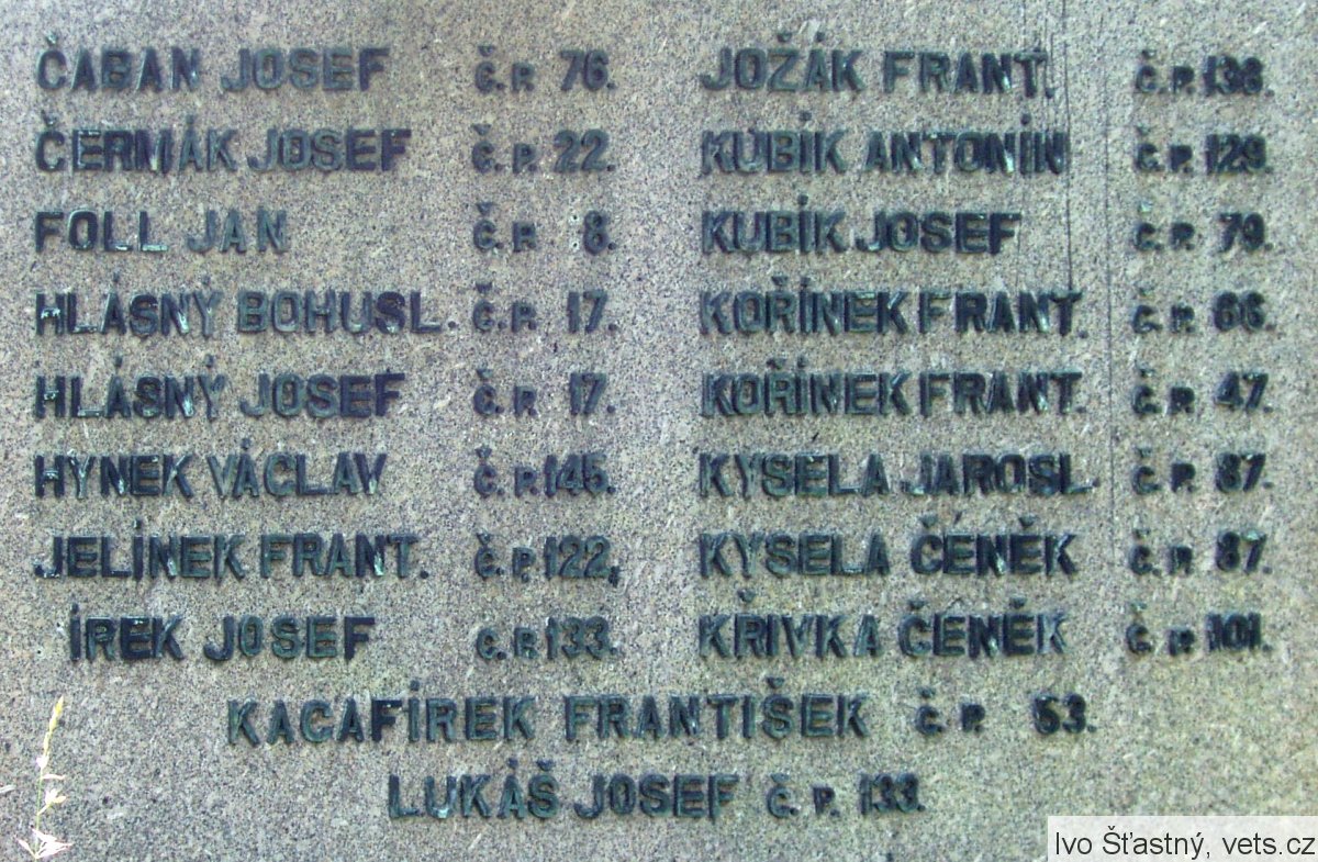 ČABAN JOSEF Č. P. 76, ČERMÁK JOSEF Č. P. 22, FOLL JAN Č. P. 8, HLÁSNÝ BOHUSL. Č. P. 17, HLÁSNÝ JOSEF Č. P. 17, HYNEK VÁCLAV Č. P. 145, JELÍNEK FRANT. Č. P. 122, JÍREK JOSEF Č. P. 133, JOŽÁK FRANT. Č. P. 136, KUBÍK ANTONÍN Č. P. 129, KUBÍK JOSEF Č. P. 79, KOŘÍNEK FRANT. Č. P. 66, KOŘÍNEK FRANT. Č. P. 47, KYSELA JAROSL. Č. P. 87, KYSELA ČENĚK Č. P. 87, KYSELA ČENĚK Č. P. 87, KŘIVKA ČENĚK Č. P. 101, KACAFÍREK FRANTIŠEK Č. P. 63, LUKÁŠ JOSEF Č. P. 133