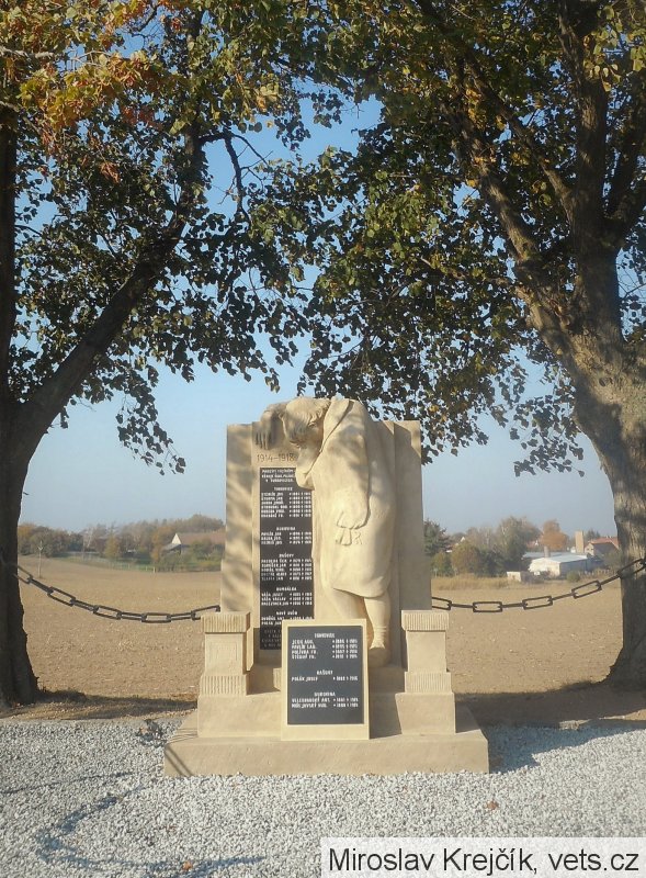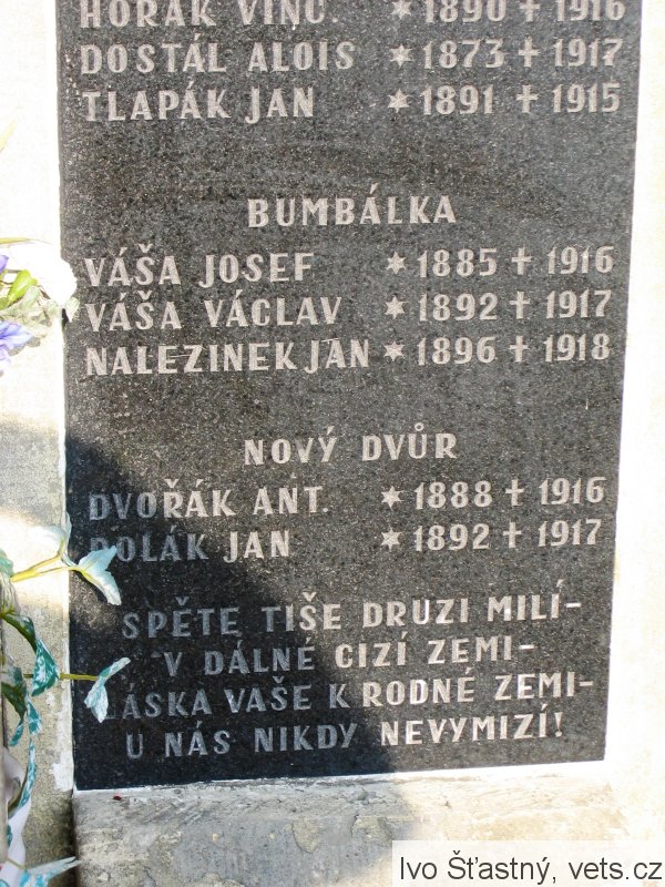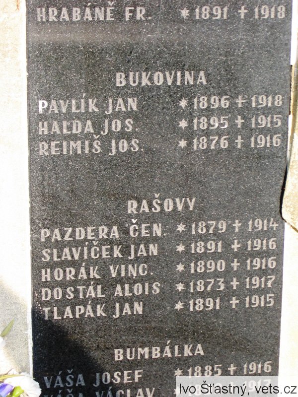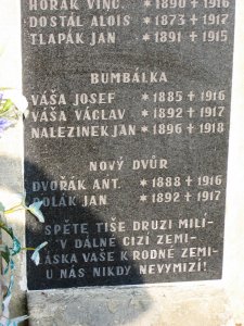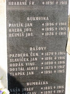 STEHLÍK JOS. *1884 +1914, ŠTURMA JAN *1880 +1915, JANDA JINDŘ. *1898 +1918, STROUHAL BOH. *1890 +1918, KOBERA VINC. *1898 +1918, HRABÁNĚ FR. *1891 +1918