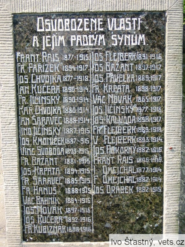 FRANT. RAIS 1877-1915, FR. PAŘÍZEK 1894-1917, JOS. CHVOJKA 1877-1918, JAN KUČERA 1890-1914, FR. JIČÍNSKÝ 1890-1914, KAR. CHVOJKA 1880-1914, JAN ŠARAVEC 1888-1914, JIND. JIČÍNSKÝ 1887-1915, JOS. KMONÍČEK 1887-1915, VINC. SVOBODA 1893-1915, FR. BAŽANT 1881-1915, JOS. KRPATA 1894-1915, FR. ŠARAVEC 1885-1915, FR. HANUŠ 1888-1915, VÁC. BAHNÍK 1894-1916, JOS. NOVÁK 1897-1916, JOS. KUČERA 1892-1916, FR. KUBIZŇÁK 1888-1916, JOS. FLEIBERK 1891-1916, JOS. BAŽANT 1897-1917, JOS. PAVELKA 1889-1917, FR. KRPATA 1898-1917, VÁC. NOVÁK 1865-1917, JOS. JIČÍNSKÝ 1877-1918, JOS. KALVODA 1898-1917, FR. FLEJBERK 1889-1918, V. FLEJBERK 1893-1914, JOS. POKORNÝ 1882-1916, FRANT. RAIS 1896-1916, J. OMEJCHAL 1877-1914, F. OMEJCHAL 1882-1914, JOS. DRÁBEK 1882-1915