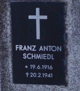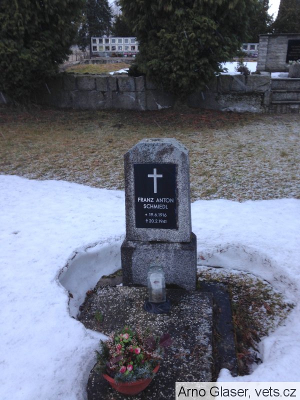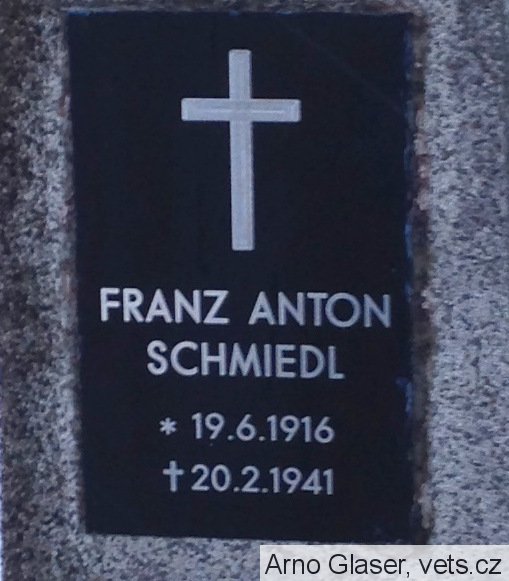 Schmiedl Anton Franz: *Schmiedeberg, Schütze. Zemřel ReLa Hof, převezen a na zdejším hřbitově pohřben. (zdroj: volksbund.de)