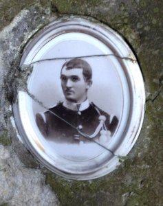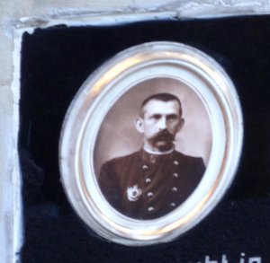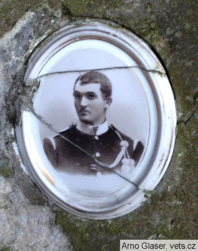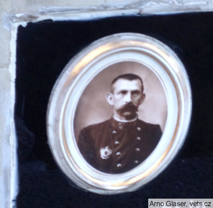 Foto v uniformě s odznakem Říšského spolku vojenských vysloužilců. Chyba v původním rytí příjmení.
