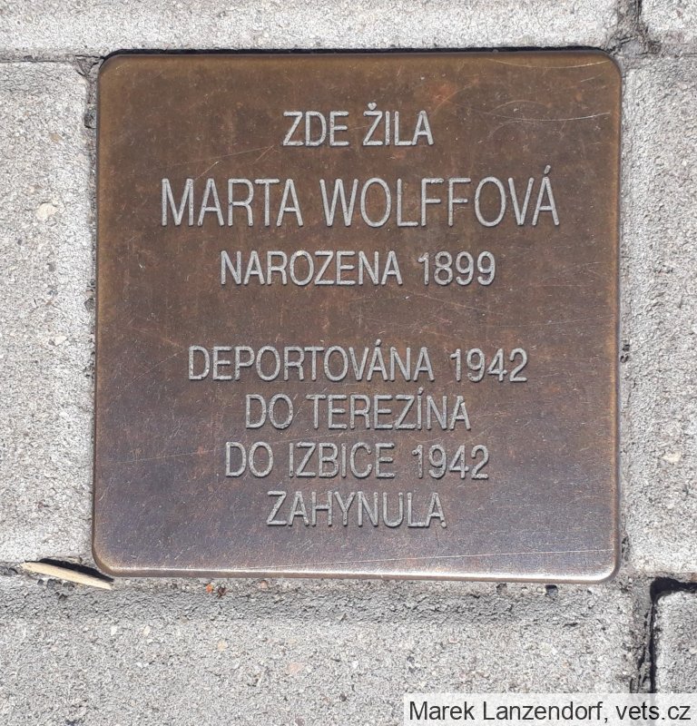 Marta Wolffová, narozena 28. 12. 1899. Poslední bydliště před deportací Roudnice. Adresa/místo registrace v Protektorátu Roudnice. Transport Y, č. 160 (22. 2. 1942, Kladno-Terezín). Transport Aq, č. 815 (27. 4. 1942, Terezín-Izbica). Zahynula.
