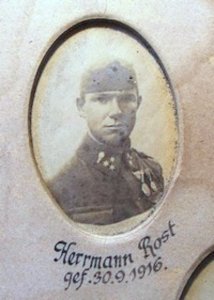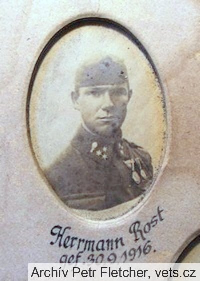 Rost Hermann August: *3.6.1890 Merzdorf, okr. Tetschen (Martiněves, okr. Děčín), č. p. 102, do rodiny majitele knoflíkárny. Svobodný, zámečník. Zugsf., Feldpilot, Feldfliegerabteilung in Wladimir Wolynsky, Rußland (dnes na Ukrajině). +30.9.1916 FeldLaz. XIII Podberezie (dnes Pidberezzja, Ukrajina), zranění břicha. 1.10.1916 tamtéž pohřben. Později exhumován, převezen do Ober Politz (Horní Police) a zde 19.1.1917 pohřben. Nelokalizováno, zrušeno.