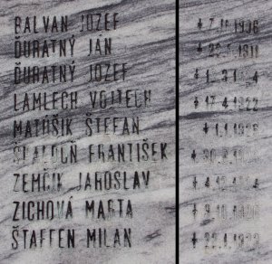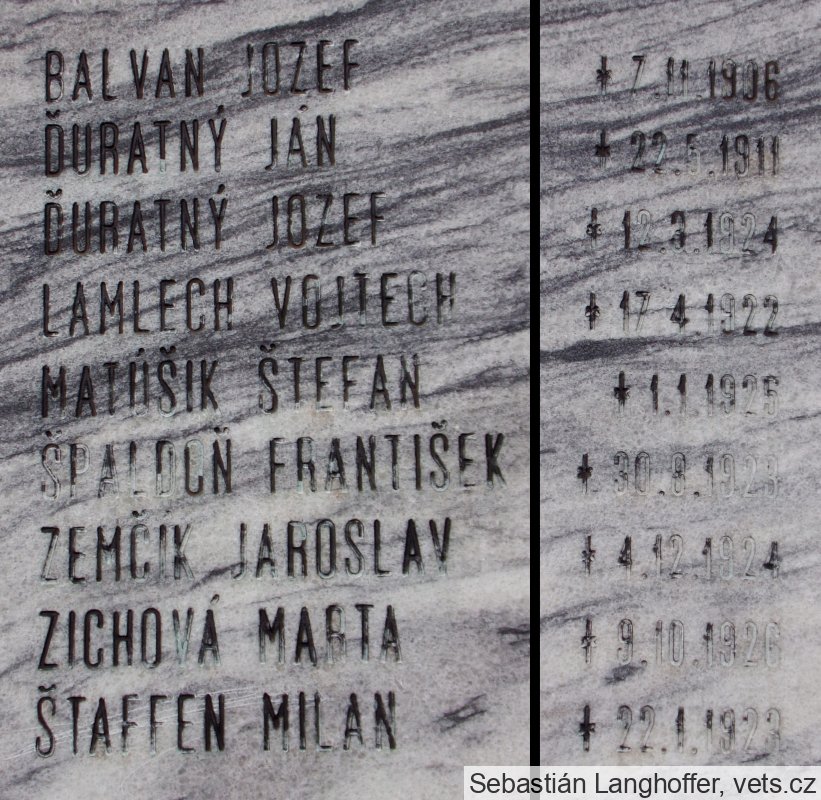 BOĽO JÁN st. 1907-1944. BROZ JOZEF 1903-1945. DANAJ JÁN 1900-1945. HANUŠÁK ALOJZ 1903-1944. KOLIBÁČ VINCENT 1910-1944. KUBA ŠTEFAN 1904-1945. MORAVČÍK PETER 1919-1944. ŠENKÁR JÁN 1911-1945. ZABOJNÍK MARTIN 1920-1944. ZVARÍK JOZEF 1922-1945.