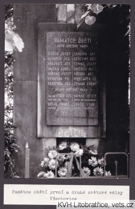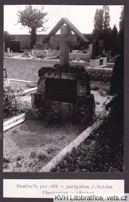 Policejní čekatel Josef Holub se narodil dne 13.3.1921 ve Všechovicích. V roce 1944 odešel do Ostravy do školy pro tehdejší protektorátní policii. Když vypukla v srpnu 1944 na Slovensku národní povstání, odjel spolu s dalšími 40 spolužáky ze školy ilegálně na Slovensko a tam se zapojil do boje proti Němcům. Dne 30. 3. 1945, jen několik dní před osvobozením Tuř. Svatého Martina, dostala se část skupiny mjr. Popova nad obcí Trnovo v Turci do boje s ustupujícím německým vojskem. A v tomto boji položil svůj mladý život i pol. čekatel Jožko Holub. Kamarádi -spolubojovníci ho pochovali v lese nad obcí Trnovo, na místě, kde padl, společně s ruským partyzánem, který také v tom čase položil svůj život při obraně naší vlasti. Tělesné pozůstatky byly převezeny do Všechovic, zásluhou kamaráda, který se vrátit a sdělil zarmouceným rodičům, kde odpočívá statečný bojpvník za svobodu svého národa a za lepší uspořádání poměrů v nové, lidově-demokratické vlasti. Za jeho zásluhy ho Ministerstvo vnitra povýšilo in memoriam na praporčíka.