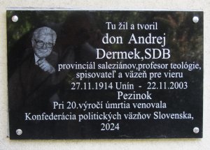Andrej Dermek (27.11.1914 Unín -22.11.2003 Pezinok) teológ, provinciál a trpiteľ za vieru. V roku 1932 vstúpil do noviciátu saleziánov v Hronskom Beňadiku. Za kňaza ho vysvätili 5.4.1942. Po likvidácii rehoľných spoločností v noci z 13. na 14.4.1950 ho internovali v sústreďovacom kláštore v Podolínci, odkiaľ ušiel ešte v tom istom roku. Po neúspešnom prechode hraníc ho v apríli 1951 zatkli, vypočúvali a mučili, v roku 1952 vo v Bratislave odsúdili na 14 rokov. Väznili ho v Ilave, v máji 1960 ho na základe amnestie podmienečne prepustili. Po prepustení pracoval ako robotník, neskôr v administratíve. Po odchode do dôchodku v roku 1974 pracoval v podzemnej cirkvi. Zomrel v Charitatívnom dome v Pezinku.
