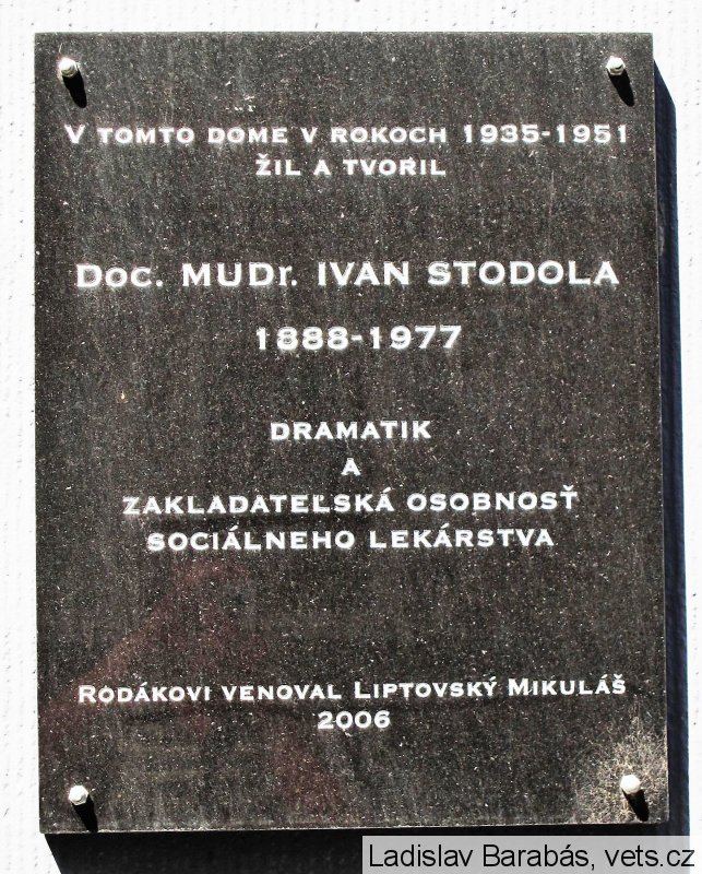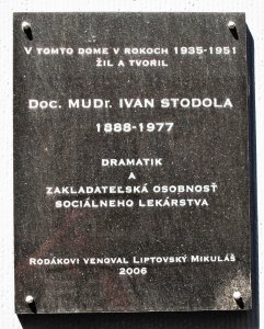 MUDr. Ivan Stodola (10.3.1888 Lipt. Mikuláš - 26.3.1977 Piešťany) spisovateľ, dramatik a lekár. V rokoch 1914-18 pôsobil na ruskom fronte ako vojenský lekár. V decembri 1951 ho zaistila Štátna bezpečnosť a obvinila ho zo sabotáže. Bol odsúdený na 8 rokov väzenia a konfiškáciu celého majetku. V rokoch 1951 bol väznený v Košiciach, Bratislave, Ilave a v Prahe na Pankráci. Prepustený bol v roku 1953 na základe prezidentskej amnestie, naďalej však bol perzekvovaný.