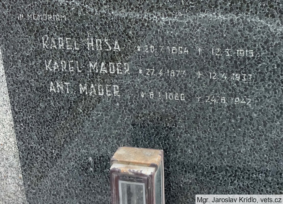 Hosa Karel, *1894, místo narození: Louny, okr. Louny, domovem: Louny, datum úmrtí: 12.3.1915, příčina úmrtí: zemřel, místo úmrtí: Stakčín, okr. Snina, Slovensko, bojiště: ruské bojiště-severní fronta, místo pohřbení: Stakčín, poznámka: náhradní prapor 46. čs. pěšího pluku.