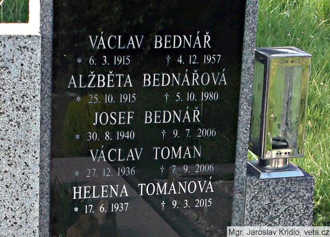Bednář Václav, *6.3.1915, Volkov, Volyň, národnost česká, vojín, kmenové číslo 13.406/M, datum a místo odvodu 09.06.1944 ČSVJ/NT, 11.06.1944 (PR121/44), Kaměněc Podolskij, č. protokolu 10.764,