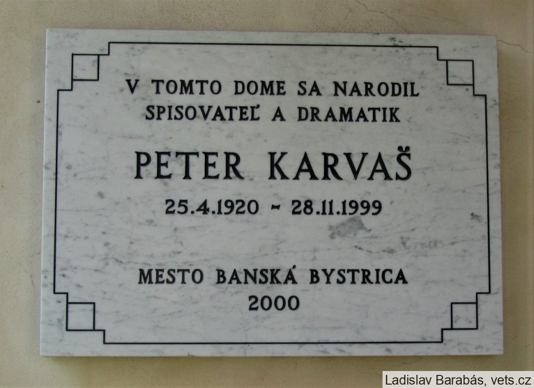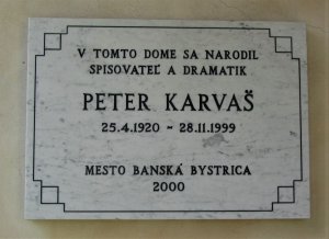 Peter Karvaš (25.4.1920 Banská Bystrica – 28.11.1999 Bratislava) dramatik, prozaik a divadelný teoretik. Počas 2. svetovej vojny bol rasovo prenasledovaný a internovaný v pracovnom tábore (jeho rodičia boli obeťami holokaustu). Počas Slovenského národného povstania pracoval v Slobodnom slovenskom vysielači. Kvôli odmietavému postoju k okupácii ČSSR v roku 1968 mal zakázané publikovať až do roku 1990.