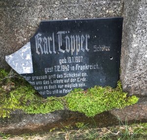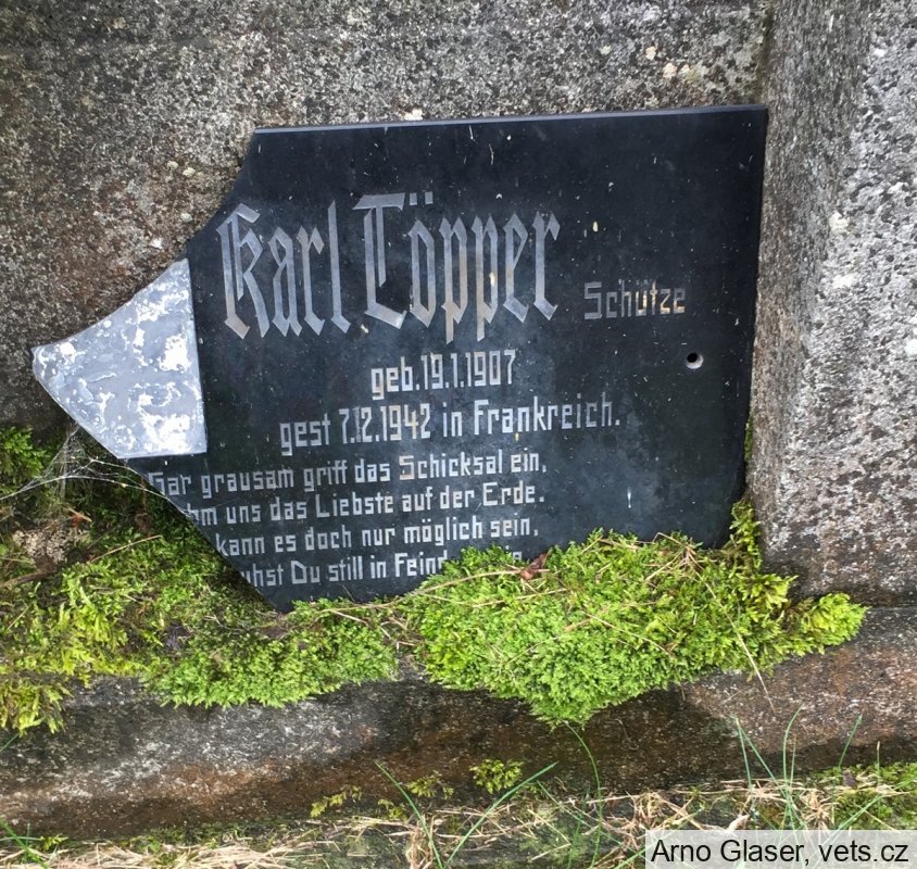 Töpper Karl: *19.1.1907 Ober Koblitz (Horní Chobolice, okr. Litoměřice). +17.12.1942 Amiens, Francie. Pohřben Bourdon, Francie, blok 31, řada 12, č. 456.