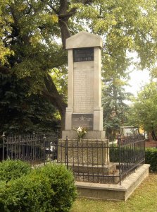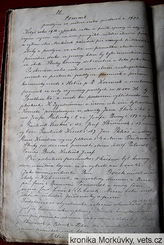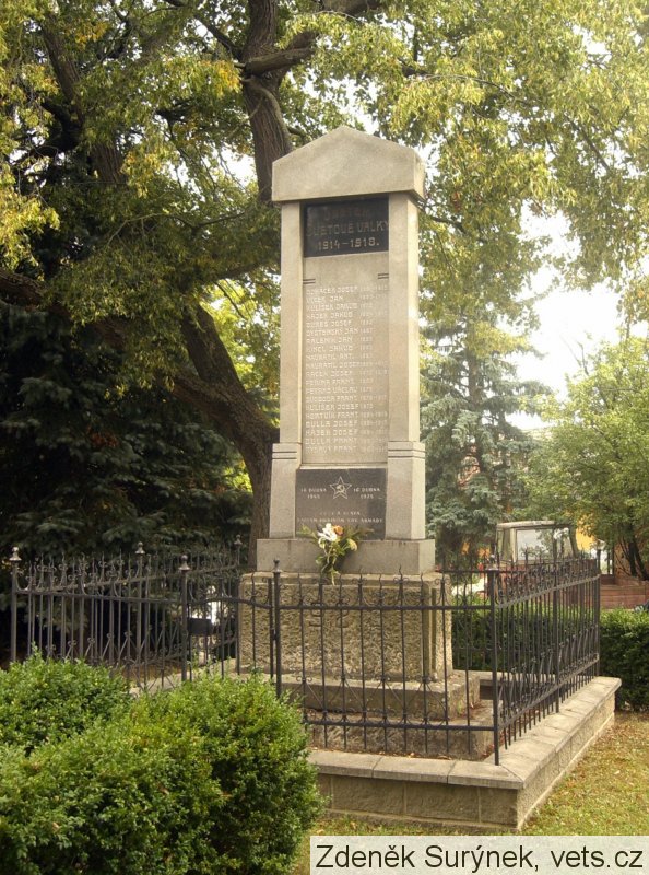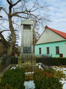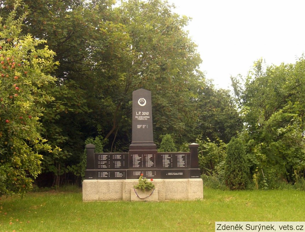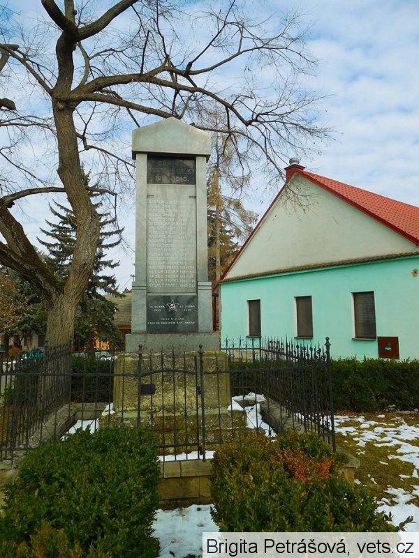 Po skončené válce sešlo se nové obecní zastupitelstvo a usneslo se postaviti padlým pomník a pozván kamenický mistr z Holiče p. R. Kocourek a umluven pomník ze žuly se jmény padlých za 10.000 Kč, tj. Desettisíc Kč a místo ku postavení vyhlídnuto na pláckách. K vyjednávání a řízení celé věci bylo zvoleno "Komite" pozůstavající ze starosty Jana Škrle č. 60, z rad. Josefa Malinky č. 8, z r. Josefa Peřiny č. 187, z výboru . František Luskač č. 165, Josef Skřivánek č. 13, mimo výboru František Kincl č. 167, Jan Petráš a vdovy Marie Kinclová nyní Jílková č. 4 a Anna Ráčková č. 29.