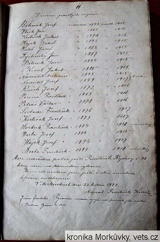 V Morkůvkách dne 22. 1. 1922 napsal Fr. Kincl.