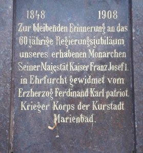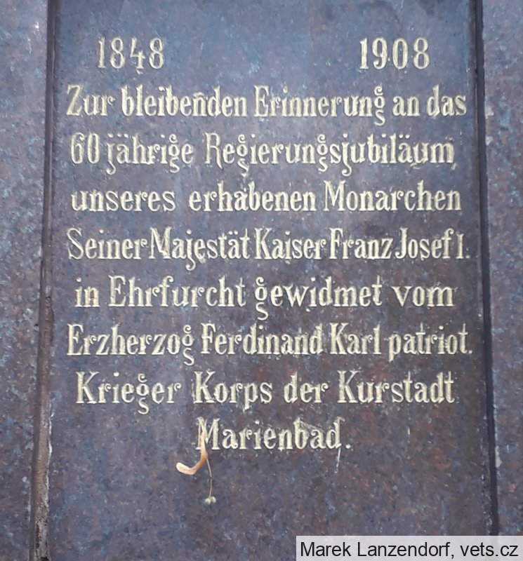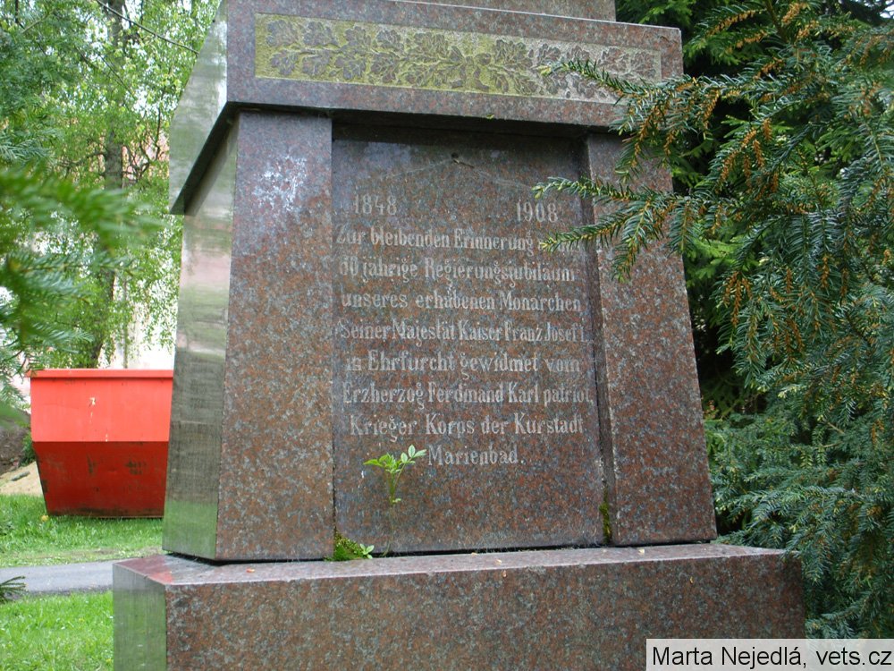 Pomník z rudohnědého švédského mramoru stál původně na Kostelním náměstí v Mariánských Lázních, kde byl odhalen roku 1908 u příležitosti 60 let panování císaře Františka Josefa I. Po 1. světové válce byl pomník odvezen na městský stavební dvůr a pak ho odkoupila obec Ovesné Kladruby, která ho využila k vybudování pomníku 17 obětí 1. světové války.
