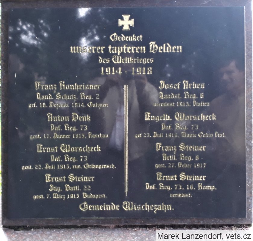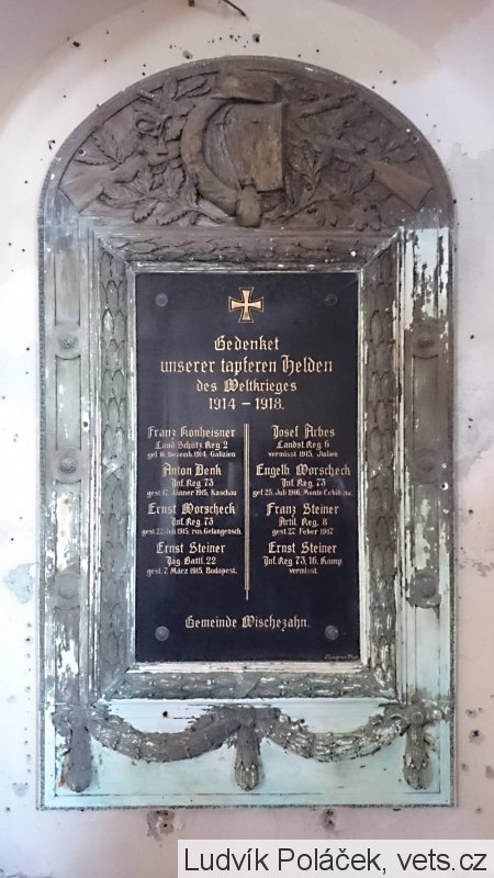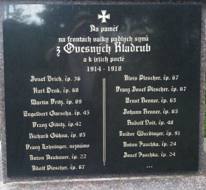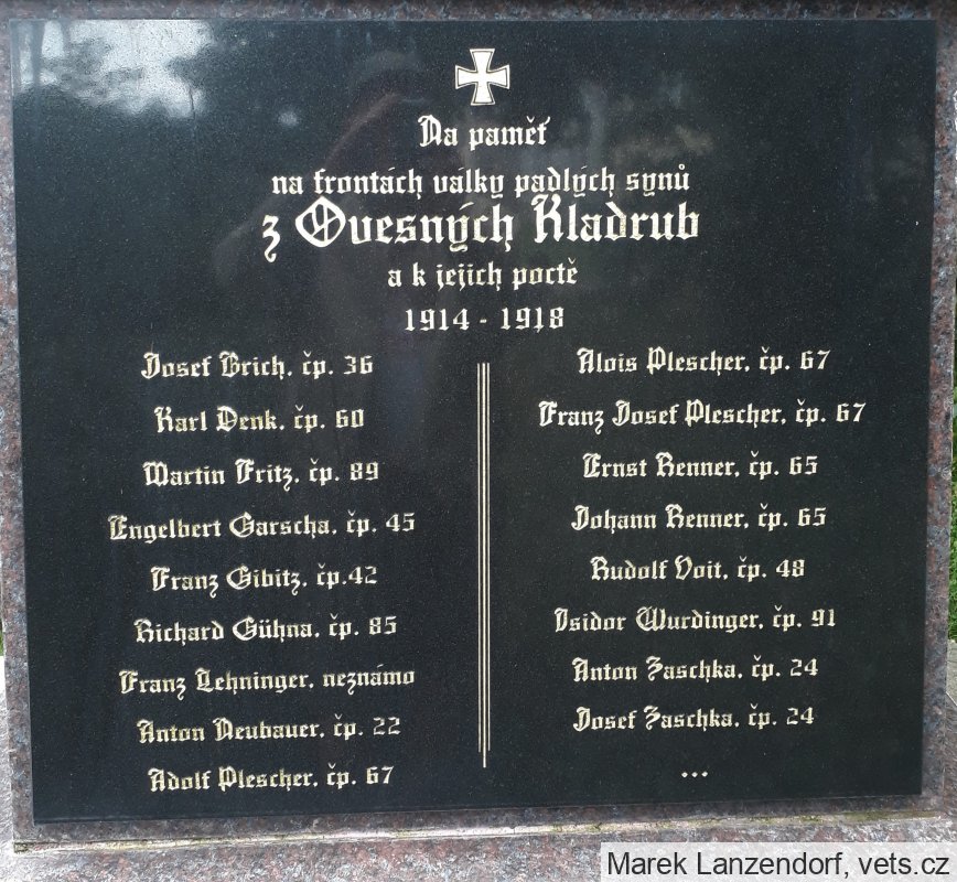 Z malé obce Vysočany (Wischezahn) u Ovesných Kladrub na Mariánskolázeňsku padlo nebo zemřelo 8 mužů. Jejich památku připomíná tato pamětní deska, která byla desítky let ukryta za obrazem v kostele sv. Vavřince v Ovesných Kladrubech. Je krásně zachovalá včetně dřevěných částí.