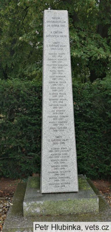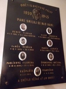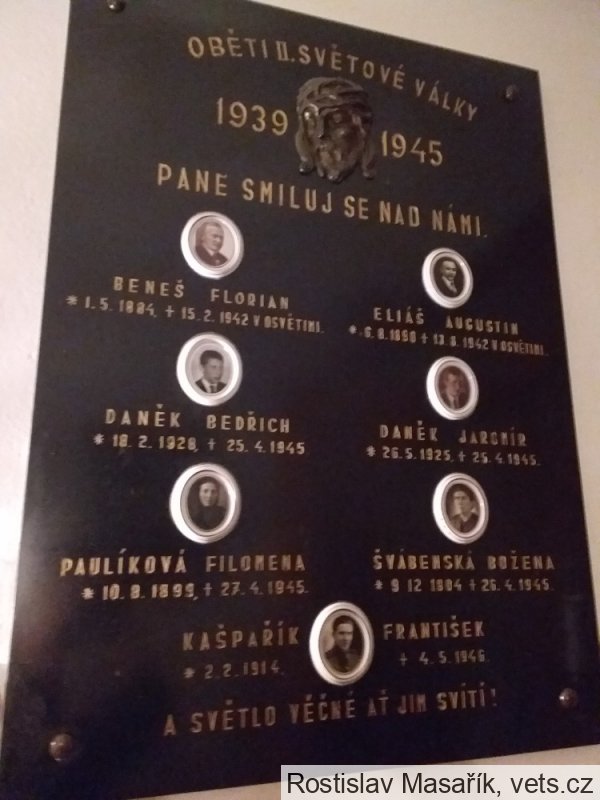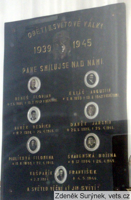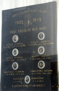 BENEŠ FLORIÁN *1.5.1884. +15.2.1942 V OSVĚTIMI., ELIÁŠ AUGUSTIN *8.8.1890 +13.8.1942.V OSVĚTIMI, DANĚK BEDŘICH *18.2.1928. +25.4.1945, DANĚK JAROMÍR *26.5.1925 +25.4.1945, PAULÍKOVÁ FILOMÉNA *10.8.1889. +27.4.1945., ŠVÁBENSKÁ BOŽENA *9.12.1904 +26.4.1945, KAŠPAŘÍK FRANTIŠEK *2.2.1914 +4.5.1945