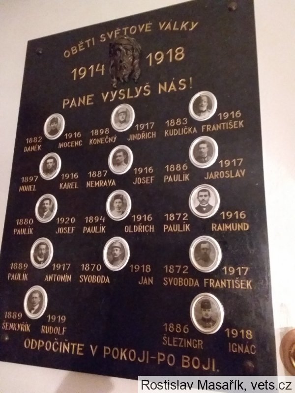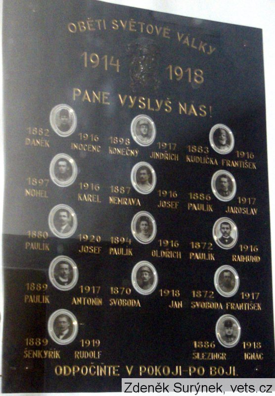 DANĚK INOCENC 1882-1916., KONEČNÝ JINDŘICH 1898-1917., KUDLIČKA FRANTIŠEK 1883-1916., NOHEL KAREL 1897-1916., NEMRAVA JOSEF 1887-1916., PAULÍK JAROSLAV 1886-1917., PAULÍK JOSEF 1880-1920., PAULÍK OLDŘICH 1894-1916., PAULÍK RAIMUND 1872-1916., PAULÍK ANTONÍN 1889-1917., SVOBODA JAN 1870-1918., SVOBODA FRANTIŠEK 1872-1917., ŠENKYŘÍK RUDOLF 1889-1919., ŠLEZINGR IGNÁC 1886-1918.