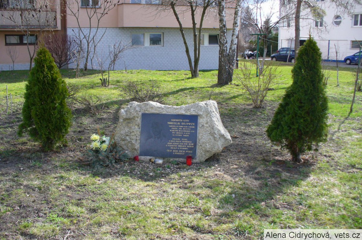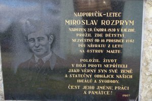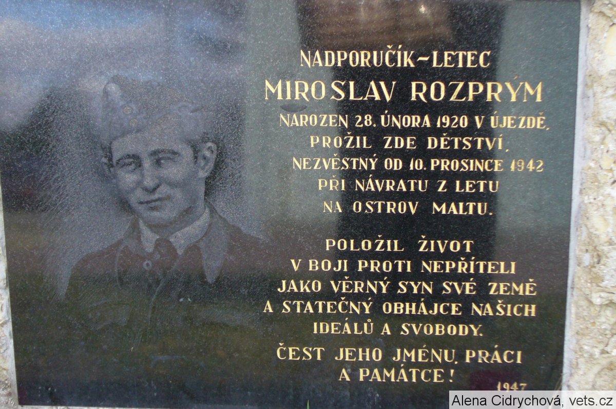 Rozprým Miroslav, podporučík, osobní číslo Z; J-1190; RAF/788213; 138677, příslušník RAF, 138th Squadron, narozen 28.2.1920, Újezd. Odveden 26.9.1939, Adge, Francie, nováček. Nezvěstný od 10.12.1942 (Notification of Death) z operačního letu na Maltu, Středozemní moře, Halifax W1002 (NF-Y). (zdroj databáze VÚA Praha)