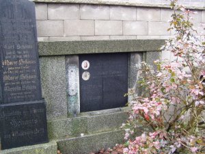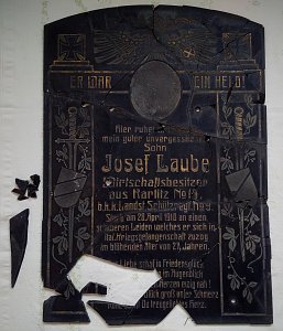 Poznámka: desky byly poškozeny v posledních letech, na druhé desce byla uvedena Theresia Laube, porodní bába z Choratic, matka Josefa Laubeho.