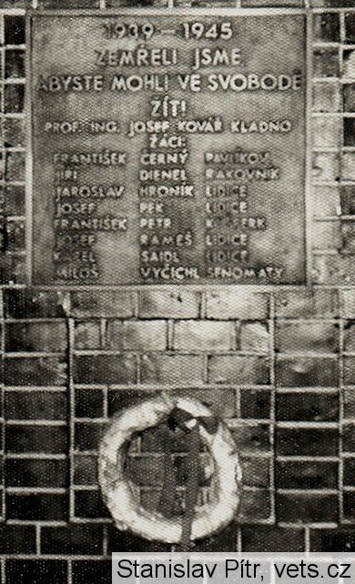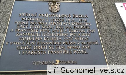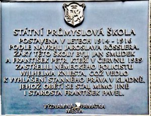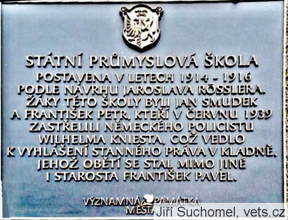 Na této desce jsou zmíněni žáci této školy - Jan Smudek a František Petr, kteří v červnu 1939 zastřelili německého policistu Wilhelma Kniesta, což mělo za následek vyhlášení stanného práva na Kladně, vůbec prvního v tehdejším Protektorátě.