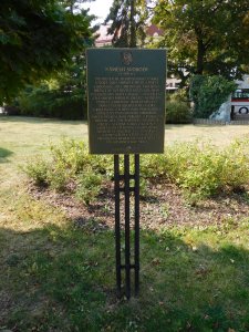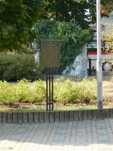 Na pamětní desce je zmíněno legionářské sousoší. Původně se jednalo o Pomník padlým, který byl slavnostně odhalen 28. října 1928 při desátém výročí vzniku republiky. Autorem byl Jan Vítězslav Dušek. Tento autor do svého díla zakomponoval vzpomínku na padlé v 1. světové válce, dále připomněl české legionáře, ale také práci obyčejných civilistů. Celé sousoší doplňovala socha T. G. Masaryka v jeho středu.