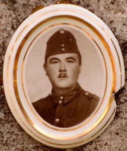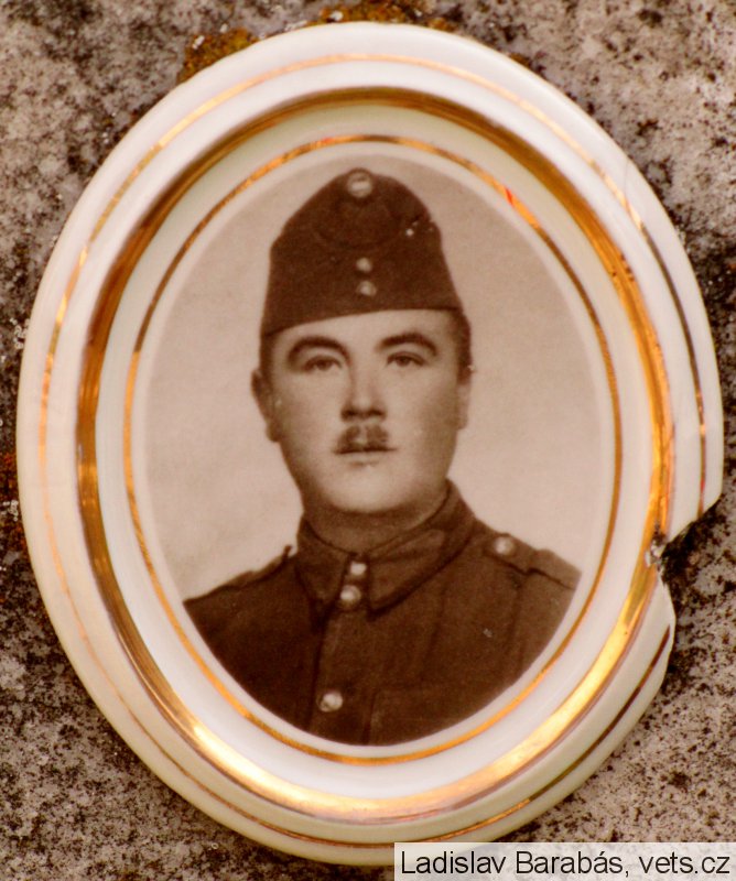 ďalší text sa nedá pre patinu bez znalosti maďarčiny prečítať z fotografie ani na mieste; foto vojaka v rovnošate