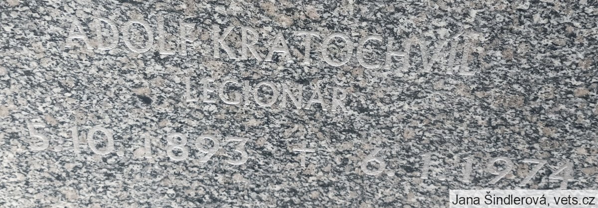 Adolf Kratochvíl, nar. 5.10.1893 Pardubice, domovská obec: Pardubice, Kostelec nad Černými Lesy, vzdělání: ob. 5 mě.3 pok. slévačská 2, zaměstnání: slévač ocele, prezenční služba u R-U útvaru i útvar v době zajetí: 10. zem.p.pl, datum a místo zajetí: 2.11.1914 Kostelnice, vojín, podání přihlášky do legií: 30.7.1918 Omsk, datum zařazení: 20.8.1918 zál. pl., (Čs. legie v Rusku), konec v legiích: 14.8.1920 demobilizován, poslední útvar: 2 stř. pl., zemřel 6.1.1974.