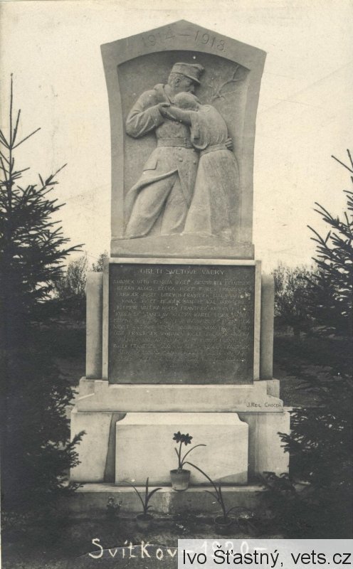 Pomník postaven původně jako památník obětem I. sv. války nákladem obce v období 1. republiky (viz další fotografie), deska obětem II. světové války vsazena v r. 1958 na popud jednoty SPB ve Svítkově.